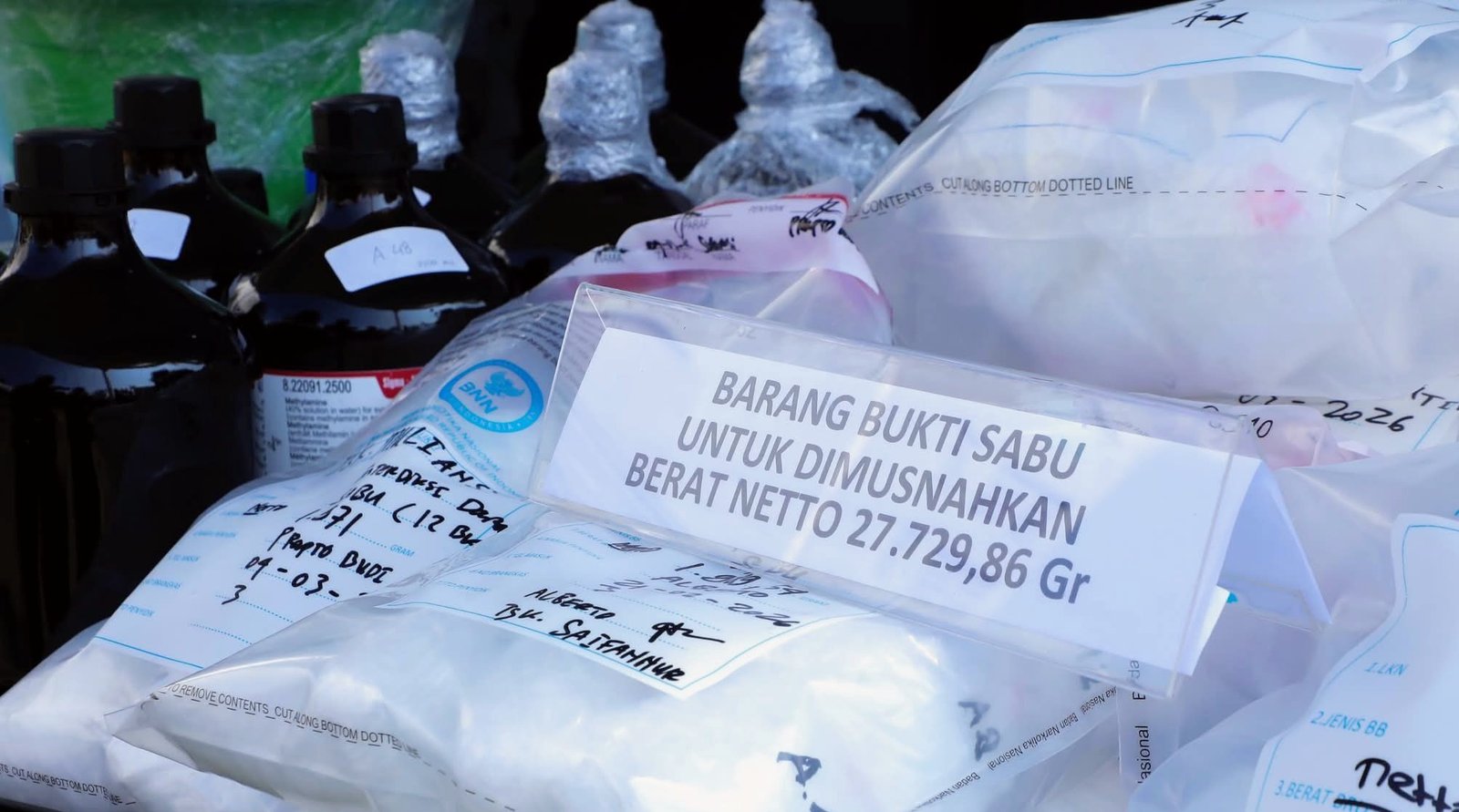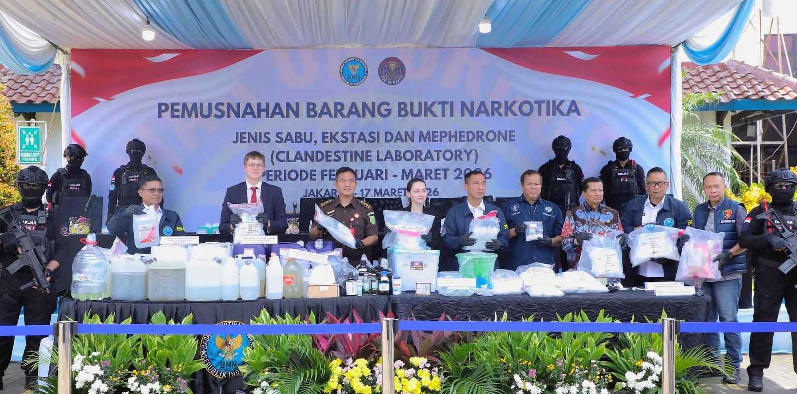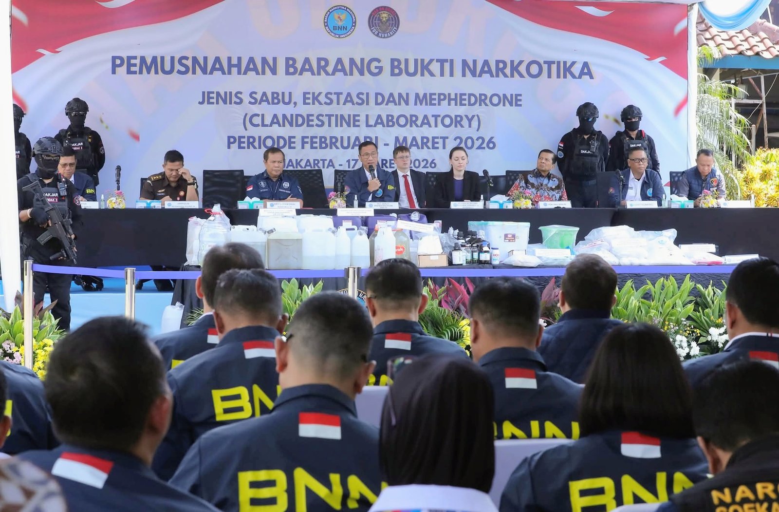 Badan Narkotika Nasional (BNN) menggelar pemusnahan barang bukti hasil tindak pidana narkotika di Lapangan Parkir BNN, Cawang, Jakarta Timur, dikutip dari bnn.go.id, Minggu (22/03). Total barang bukti yang dimusnahkan adalah sebanyak 34.211, 96 gram, dengan rincian 27.729,86 gram sabu; 1.829 gram ekstasi (3.916 butir); mephedrone padatan 643,6 gram; mephedrone cairan 7.247 milliliter; prekursor cairan 24.722 milliliter; bahan kimia padatan 4.009,5 gram; dan bahan kimia cairan 198.129 milliliter.